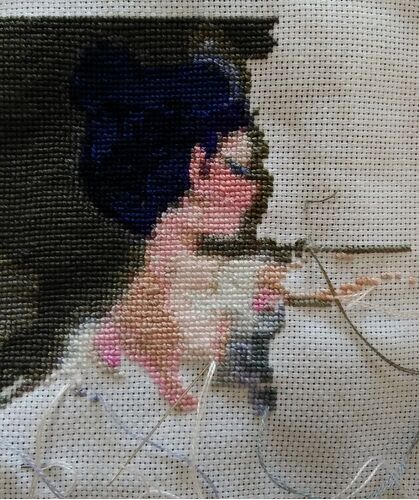 目が揃ってない! 刺してても、目のばらつきがあるのがわかるのだけど、どうやったら揃うのか。。 やっぱり、面倒でも一目一目ばってんにしていかなきゃなのかな… 22カウントに2本どりに無理があったのか。 刺し終わった部分は硬いし、かなりぎちぎちではあ…