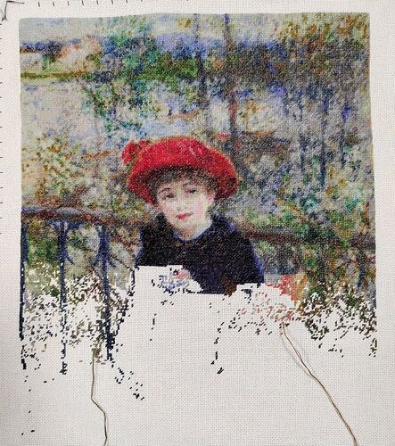 先週は、1日刺繍できる日がありました。いつもならエリザを刺すんだけど、今回はテラスにてに集中!3759目を1週間でできた!こうして画像で見るといい感じ~お蔵入りさせずに良かった~ 気になっていたドレスのベタも、それほど違和感なく、胸元のコサージュ…