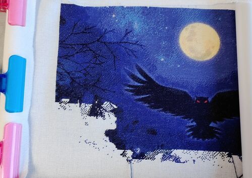 どうにも、、空の色とグラデが気に入らない。お月様はいい。でも。。 …とりあえず、森の葉っぱを刺してから、いい感じの青を探そうか。。と、先に左側へ行くことにしたんだけれど。ちょっと保留です。 完成まで2年はかかるのに、気に入らないままじゃいやだ…