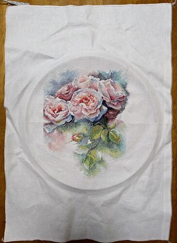 30分ずつだから、あまり進んでないのよね~(;^_^Aまぁ、仕方ないっしょ!一度針につけたら、その糸が無くなるまでor刺すところが無くなるまで刺してるので、最初は左下のバラを刺してるけど、そこが終わったら左上とか、右側とか、、全体に飛んでる。だいぶ…
